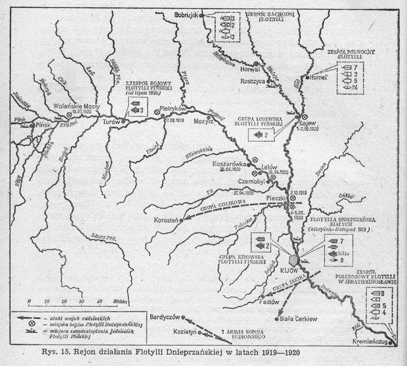 7 maja 1920 roku wojsko polskie zdobyło Kijów a w tamtejszym porcie zdobyto 17 statków, 26 motorówek i 10 barek. Dowództwo 3 armii zdecydowało że po uzbrojeniu i modernizacji jednostki te utworzą Polską Flotyllę Dnieprzańską. Plany te zniweczyły brak uzbrojenia i załóg dla tych jednostek, oraz wydarzenia które wkrótce nastąpiły. 26 maja 1920 roku rozpoczęła się ofensywa 12 armii radzieckiej na przyczółek pod Kijowem . Przeprawę wojsk osłaniały okręty Dnieprzańskiej Flotylli. By zniszczyć te przeprawy 2 czerwca wysadzono desant 1 pułku piechoty w miejscowości Witaczow. Również drugi zespół Flotylli Pińskiej miał kłopoty , w nocy z 1 na 2 czerwca 1920 roku zespół radzieckich kanonierek rozpoczął forsowanie ujścia rzeki Soża bronionego przez 2 kutry uzbrojone , baterię 4 dział 152 mm i 10 dział 75 mm. Siły te nie wystarczyły do powstrzymania okrętów radzieckich, mimo straty kanonierki „Mietkij” zatopionej przez polskie baterie, przedostały się na Prypeć . W pościg za nimi ruszyły kutry uzbrojone i bateria artylerii konnej. Rosjanie 2 czerwca 1920 roku dopłynęli do ujścia Prypeci gdzie postawili miny. 3 czerwca okręty radzieckie rozpoczęły przeprawianie wojsk radzieckich w wsi Pieczki , by zlikwidować tą przeprawę zostały wysłane okręty kijowskiej grupy Flotylli Pińskiej. Razem z wojskami lądowymi zaatakowano mosty w okolicy Okuninowa gdzie 4 czerwca o 16:00 doszło do walki z radzieckimi kanonierkami „Mstitielnyj” i „Małyj”. Walkę przerwał zmrok , Polacy zamierzali kontynuować atak rano 5 czerwca 1920 roku, lecz zostali sami zaatakowani przez 4 kanonierki radzieckie i zmuszeni do obrony. Po wyczerpaniu amunicji musieli się wycofać do Kijowa. W tym samym dniu pod Samhorodkiem Armia Konna Budionnego przerwała front 3 armii polskiej i zagroziła okrążeniem Kijowa. Był to początek końca nie tylko wyprawy kijowskiej , ale również Flotylli Pińskiej, teraz wydarzenia potoczyły się szybko. Nastąpiła ewakuacja wojsk polskich z Kijowa, o ile wojską lądowym to się udało to okręty zostały odcięte od Pińska. Jeszcze walczyły, 9 czerwca zdobywają dwa transportowce radzieckie, „Pancerny 1” zdobywa na Deśnie dozorowiec radziecki „Ostrie”, pomagają wojską lądowym w przeprawie przez Irpień, ale to już ostatnie akcje kijowskiej części flotylli. Przychodzi dzień gdy trzeba zniszczyć to co jest własnym domem. 11 czerwca 1920 roku zostają zniszczone zdobyczne jednostki pływające, po południu 11 czerwca zostają zatopione 2 polskie transportowce w rejonie Kozarowicz na Dnieprze. Zespół bojowy dowodzony przez por. mar. B. Mohacza zatopił swe okręty w rejonie Mieżegoria przy ujściu Desny. Załogi lądem przedarły się do Gostomia a dalej do Mozyrza. Następna ofensywa radziecka z Ukrainy odcięła w rejonie Łojewa dwa kutry uzbrojone „MB 3” i „MP 1”. 18 czerwca 1920 roku po zatopieniu tych jednostek część bojowa Flotylli Pińskiej przestała istnieć. Pozostał tylko zespół transportowy wycofujący się z wojskiem na pokładzie. Ewakuowano również zdobyczne jednostki. Ataki kanonierek radzieckich spowodowały konieczność zorganizowanie nowego zespołu bojowego . Na początku lipca utworzono taki zespół z kanonierki „Pancerny 2” (zdobyczny „Usierdnyj”) i 3 kutrów uzbrojonych „M 7”, „M 51”, „M 47”, dowodzony przez por. mar. Stanisława Hryniewieckiego. Nie dane było temu zespołowi zażyć sławy wojennej. 4 lipca Rosjanie rozpoczęli ofensywę która wyprowadziła ich na przedpola Warszawy, zespół bojowy wraz z transportowcami był w ciągłym odwrocie na Prypeci, utrudnionym nie tylko działaniem okrętów radzieckich ale również coraz gorszą sytuacją hydrograficzną . Poziom wody opadał z każdym dniem odkrywając liczne mielizny. Z tego powodu zatopiono 19 statków w drodze do Pińska. Reszta zespołu dotarła do Mostów Wolańskich 18 lipca , w tym samym dniu musiano stoczyć pojedynek z kanonierkami radzieckimi. 19 lipca 1920 roku jednostki dotarły pod rozległą mieliznę, z braku czasu na przekopanie kanału większość jednostek zatopiono, w tym kanonierkę „Pancerny 2”. Ostatnim jednostkom udało się dotrzeć do portu w Pińsku gdzie okazało się że to koniec drogi . Przedarcie się na Wisłę było nie możliwe, okazało się że Kanał Królewski wysechł całkowicie. Nie pozostało nic innego jak zatopić ostatnie 13 statków w porcie Pińskim. Nastąpiło to 24 lipca 1920 roku. Dzień ten był również końcem Flotylli Pińskiej roku 1920.